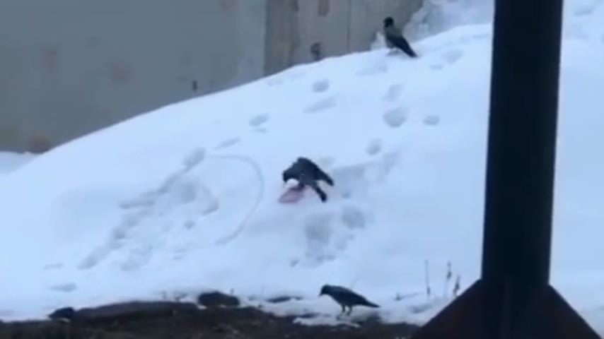 Na zasněženém svahu, vrána používá plastovou objekt bavit dělat snowboard.