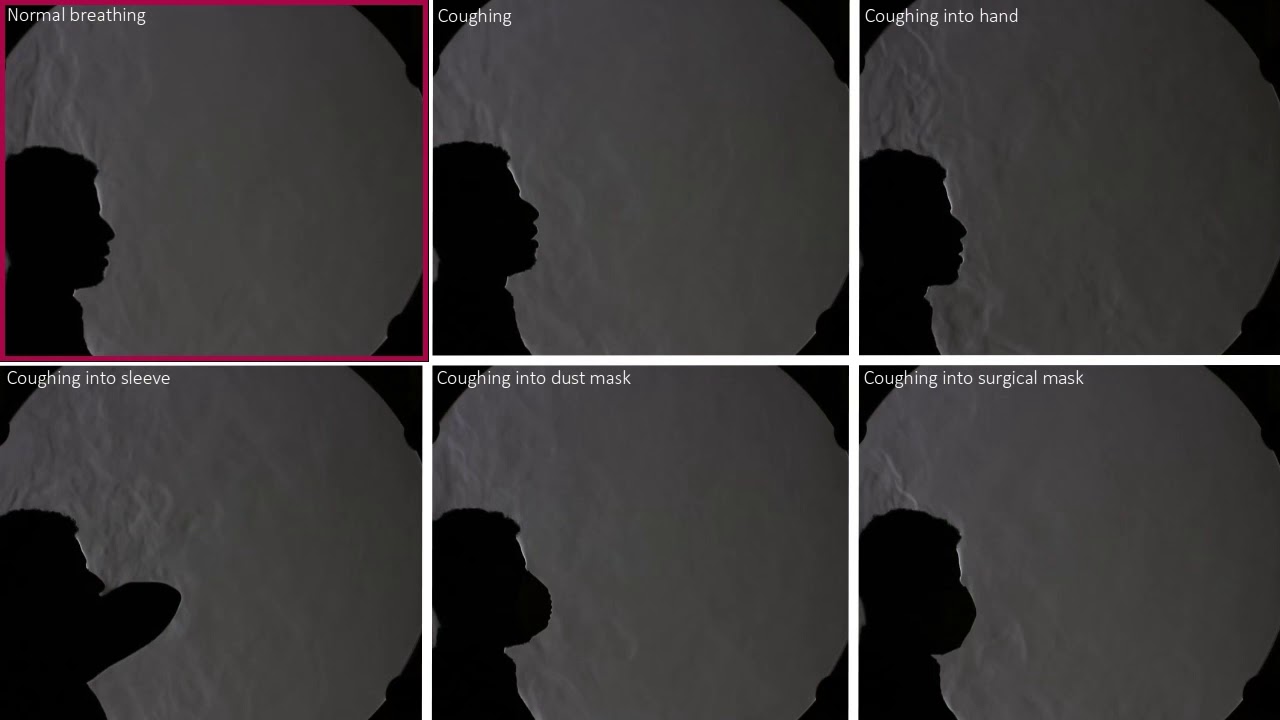 Bauhaus University ve Výmaru, Německo provedl experiment ke zjištění, jak přenos vzduchu během kašle, s různými parametry. Dáno 6 testovacích případů: se člověk dýchá normálně, se člověk kašle, osoba kašle v ruce, loktem, masku proti prachu a obličejová maska.