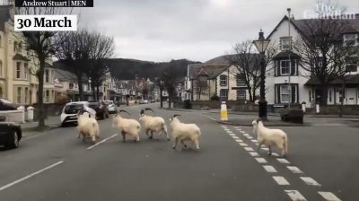 Stádo koz byly procházky v opuštěných ulicích Llandudno, North Wales, kde jsou lidé omezeny do svých domovů během pandemie koronaviru.