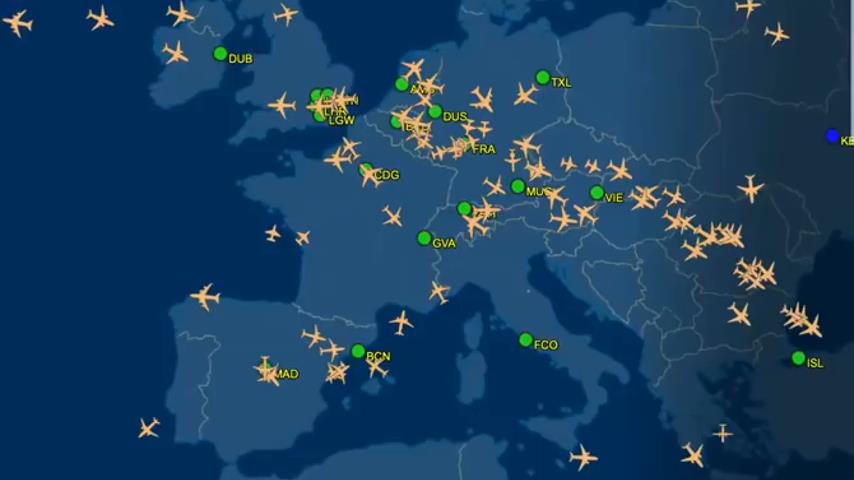 Letecká mapa ukazuje pohyb letadel po Evropě a Spojených státech 4. dubna 2020, během pandemie.
