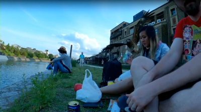 Rybář ukradne sendviče z ženských rukou, sedí u řeky v japonském Kjótu.