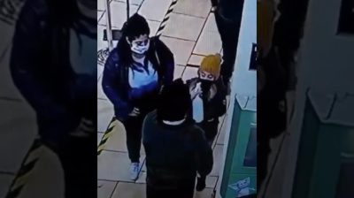 Muž zaměňuje antiseptický postřikovač s infračerveným teploměrem, který drží v ruce, když se snaží dostat teplotu malé dívky před vstupem do obchodu. Dítě poté dostane oční dezinfekční prostředek.