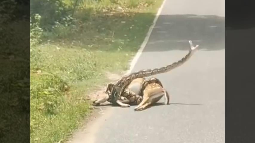 Zaměstnanec Zoo Khao Kheow v Thajsku, osvobodí jelena od boa constrictora, aby vytlačil hada z cesty.