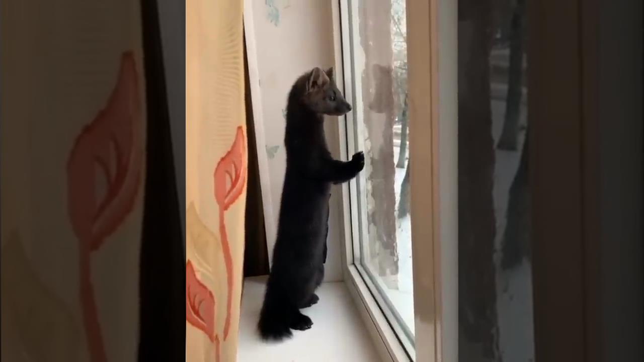 V domě v Rusku, mazlíček zimbelina skrývá svou hračku a snaží se hrát s kočkou. Zimbelina je malé zvíře spojené s lasicí.