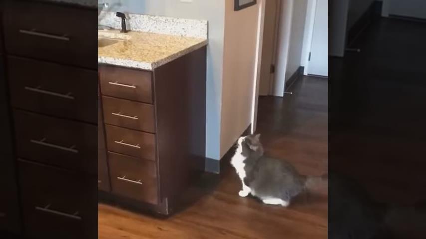 Obézní kočka se připravuje na velký skok na kuchyňském pultu.