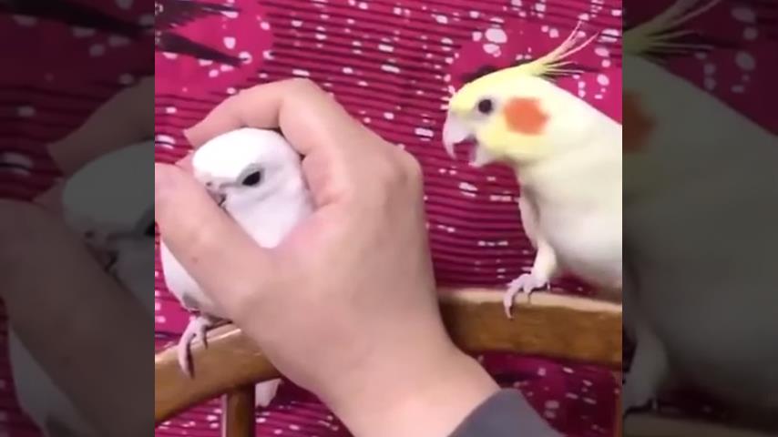 Papoušek nepřijímá ruku svého majitele, aby se dotkl někoho jiného.