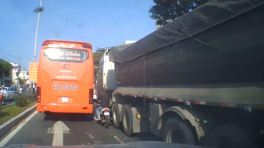 Vietnamský motocyklista se snaží projít mezi autobusem a kamionem, ale nezdaří.