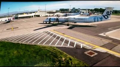 Zaměstnanci letiště Aberdeen ve Skotsku se snaží zastavit letadlo, které se valí uličkou. Jeden z nich dokonce jde k nosu letadla a snaží se ho tlačit...