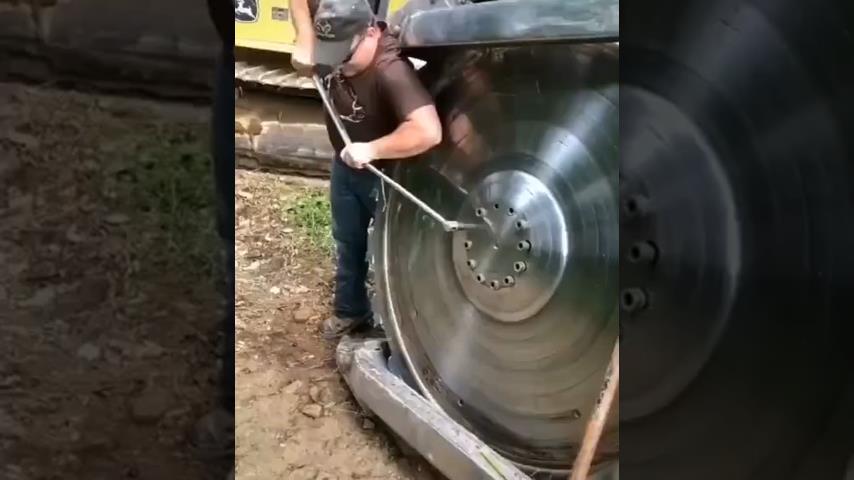 Člověk má potíže s odšroubováním disku z obrovské kotoučové pily. Nakonec, řešení poskytne buldozer.
