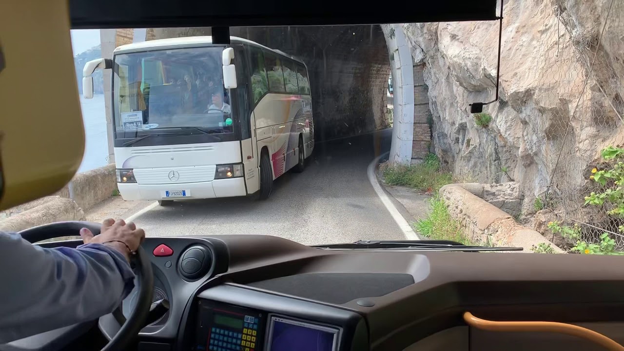 Řidiči autobusů se snaží zapadnout do velmi úzké ulice, se nachází na pobřeží města Amalfi v Itálii.