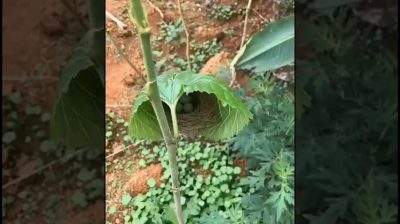 A Krejčí pták (Krejčí) postavil své hnízdo uvnitř listu.