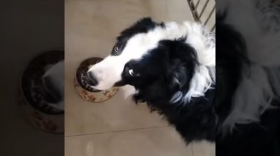 Pes se pozorně dívá na svého majitele, což mu dalo přísnou stravu.