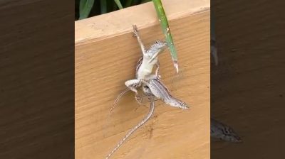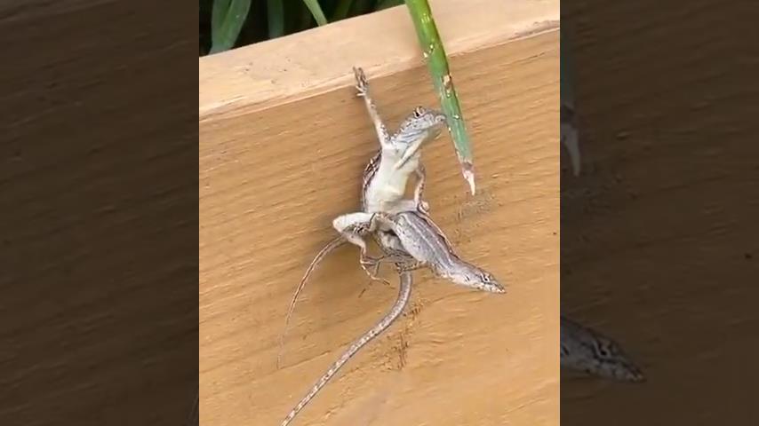 Ještěrka a její kamarád visí z okraje jardiniere v legrační poloze, v South Miami Heights na Floridě.