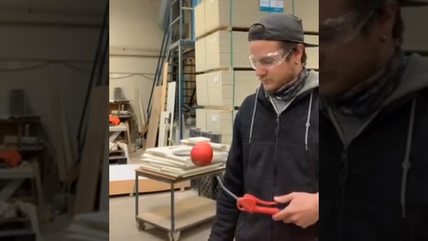 Na workshopu v australském Melbourne, muž se houpá a točí jablko stlačeným vzduchem. Jablko se pak začne otáčet rychleji a rychleji a nakonec exploduje.