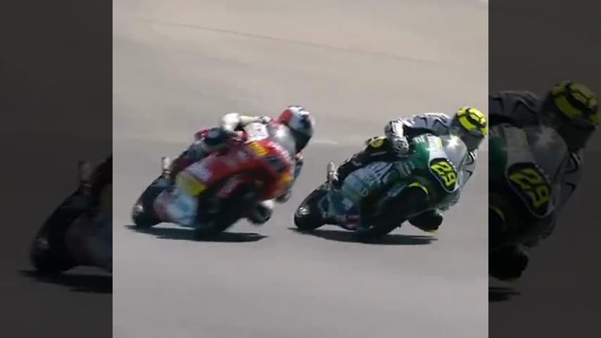 Po nehodě v San Marinu MotoGP v roce 2009, jezdec Paul Espargaro hledá svůj motocykl, který spadl za ochranné bariéry.