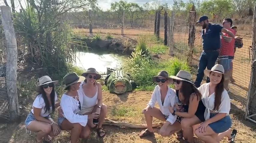Dva zaměstnanci tábora Top End Safari Camp v australském Darwinu si dělají legraci z turistů, kteří se chtějí nechat vyfotografovat před velkým krokodýlem. Člověk předstírá, že je chce vyfotografovat při natáčení videa, zatímco druhý hodí kousek masa na krokodýla, aby udělal ostrý pohyb a zavřel čelist.