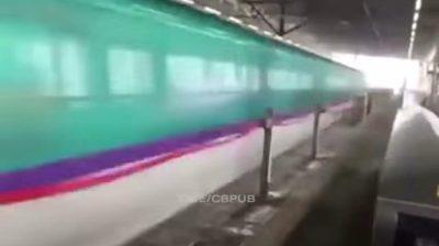 Shinkansen vlak v Japonsku, prochází tunelem rychlostí přes 300 km / h.