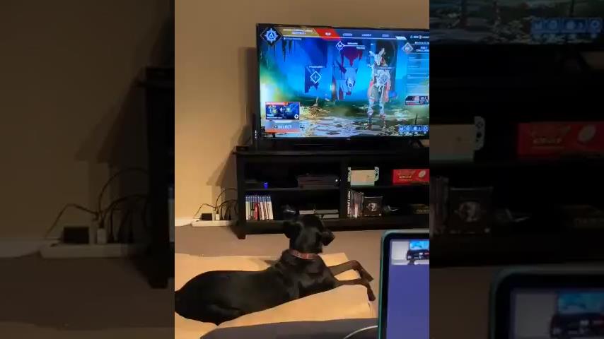 Pes se lekne, když postava Revenanta z videohry „Apex Legends“ náhle začne běžet k obrazovce.