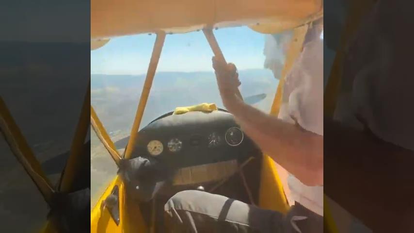 Připoután k opasku kalhot pomocí lana, muž opustí kokpit Piper Cub, aby za letu restartoval vrtuli.
