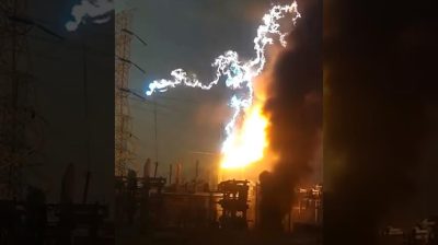 Zkrat v elektrárně v Mexiku vytváří velký oblouk ve 400 napěťových kabelech.000 Volt.
