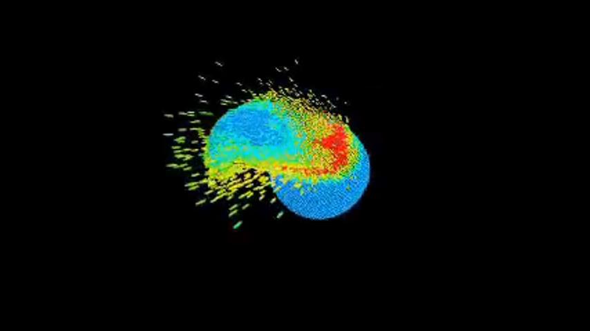 3D simulace srážky Země s planetou o velikosti Marsu, s přihlédnutím ke všem fyzikálním charakteristikám planet a gravitačním silám. Nejmenší planetou je planeta Mars (poloměr 3 389 kilometrů).