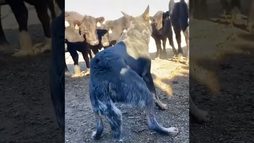 Pes se stará o krávy, které se blíží ke svému majiteli, když odpočívá při jídle.