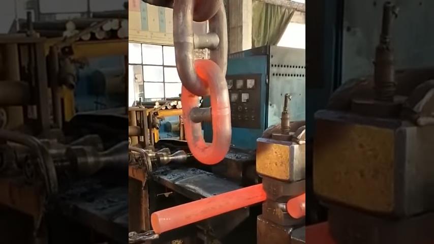 Uvnitř strojírny, vidíme velký kovový ohyb, který se proměnil v článek v obrovském řetězu.