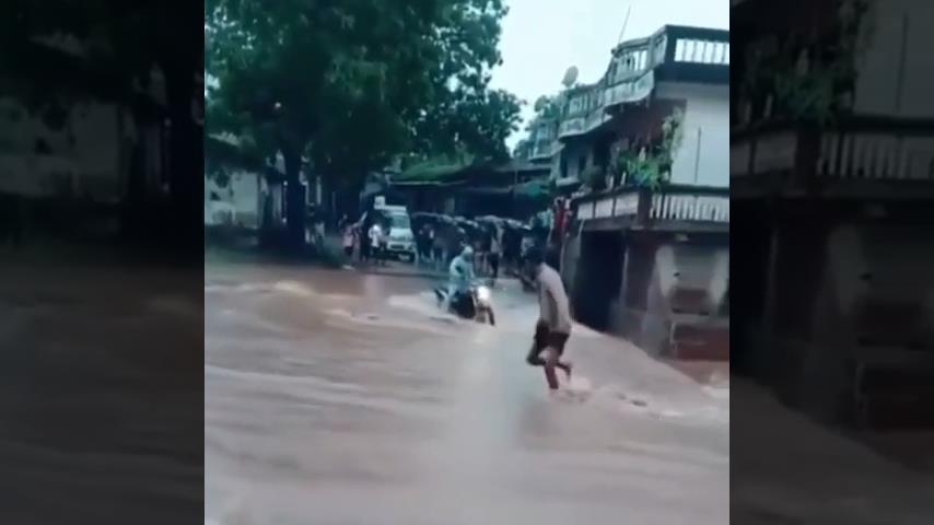 Muž se rozhodne vzdát se svého motocyklu, který je při povodni smeten silným proudem vody.