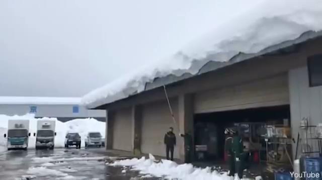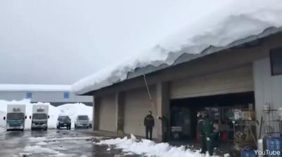 Muž v Japonsku se snaží odpratat sníh ze střechy pomocí dlouhé tyče. Jeho úsilí bude nakonec velkým úspěchem.