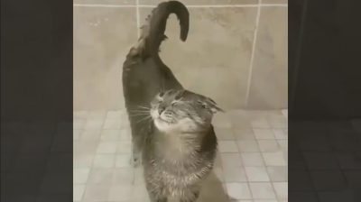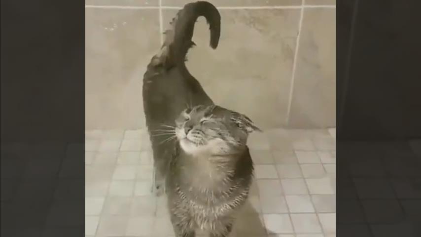 Voda je pro kočky nepříjemným prvkem, ale existují výjimky. Zdá se, že si tato kočka užívala vodu pod sprchou.