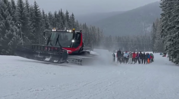 Tváří v tvář uzavření lyžařských vleků kvůli Koranai v České republice, za vychovávání lyžařů na hoře odpovídá sněžný pluh. Dodržování vzdáleností, lyžaři jsou drženi dvěma lany za sebou.