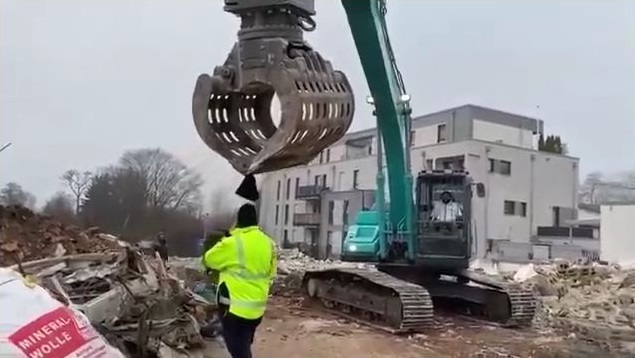 Zatímco telefonujete na staveništi, člověk ztratí klobouk z bagru.