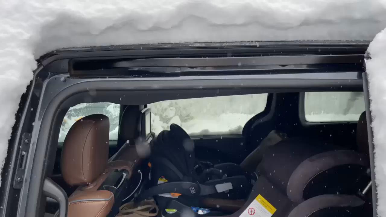 Zavírání dveří dodávky, která je úplně pokryta sněhem.