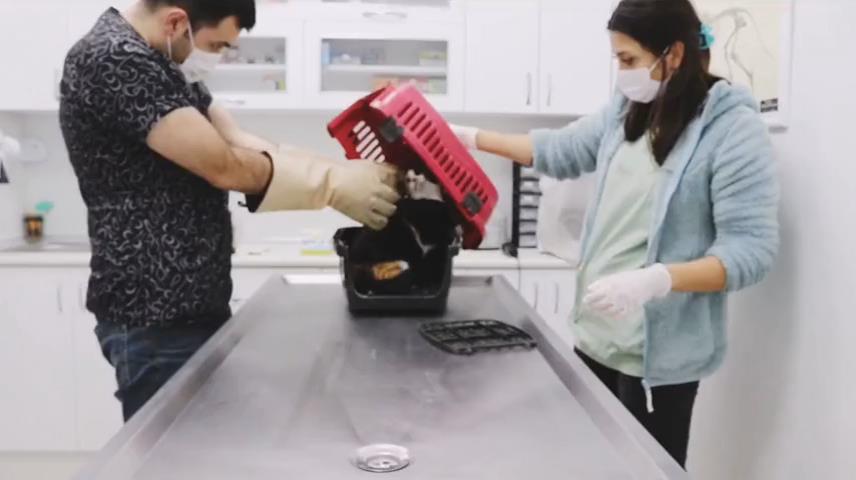 Na veterinární klinice, kočka propadne panice, když se ji veterinář pokusí dostat z krabice.
