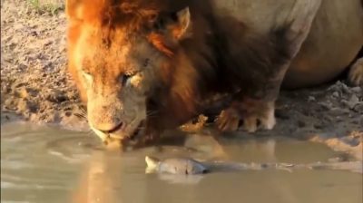 Želva se snaží zahnat lva, který ve svém rybníku pije vodu. Nebojácná želva se blíží k lví tlamě a snaží se ji kousnout. Lev byl naštvaný, pokaždé, když změní polohu, aby mohl v klidu pít vodu.