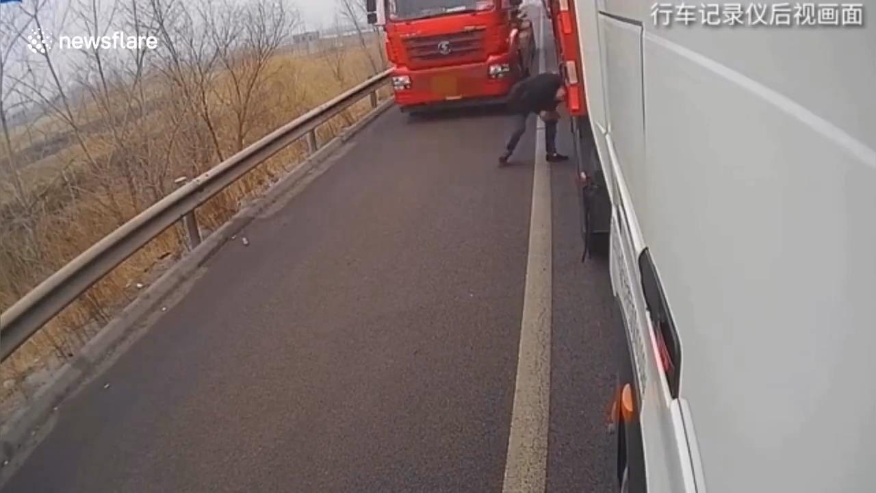 Řidič kamionu v Číně je na dálnici nakopne, aby zjistil problém s přívěsem svého vozidla. V tu chvíli ho zasáhlo další nákladní vozidlo vrhající se do nouzového pruhu, když vyšel zpod přívěsu.. Muž, který měl štěstí ve svém neštěstí, vyvázl jen s několika lehkými zraněními.