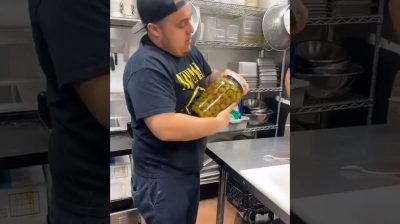 V kuchyni restaurace, úředníci se snaží otevřít sklenici oliv se zaseknutým víkem.
