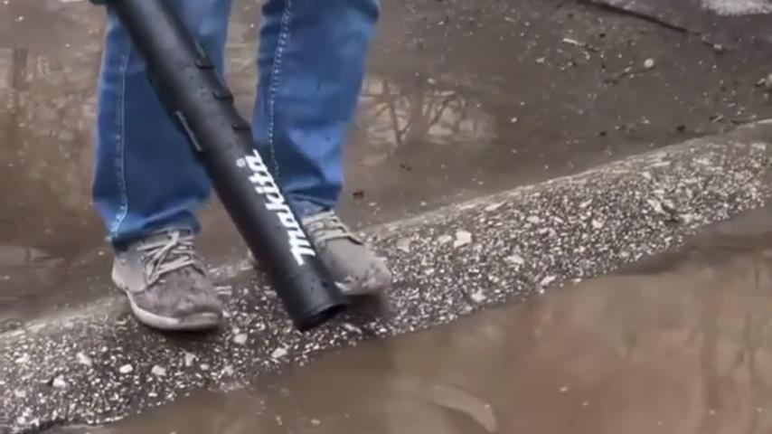Muž použije dmychadlo, přejít zatopenou cestu, aniž byste se namočili.