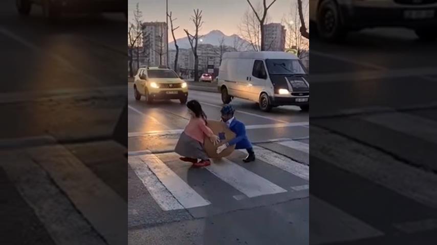 Muž má na sobě uniformu, což dává iluzi, že dva trpaslíci nosí krabici.