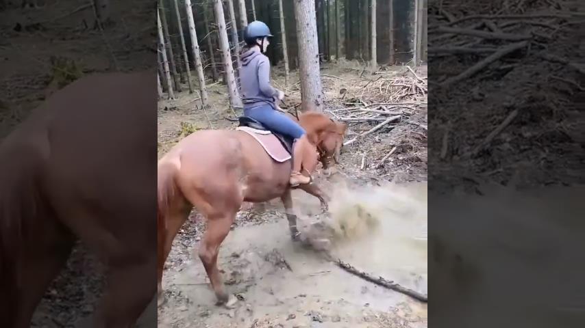 Během naší procházky, kůň najde příležitost hrát, když projde kalužemi vody.