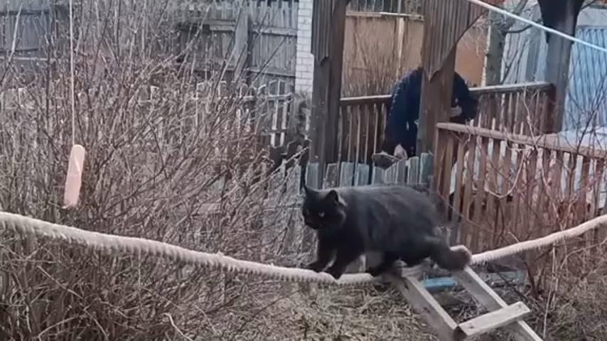 Kočka se při chůzi na laně snaží chytit klobásu.