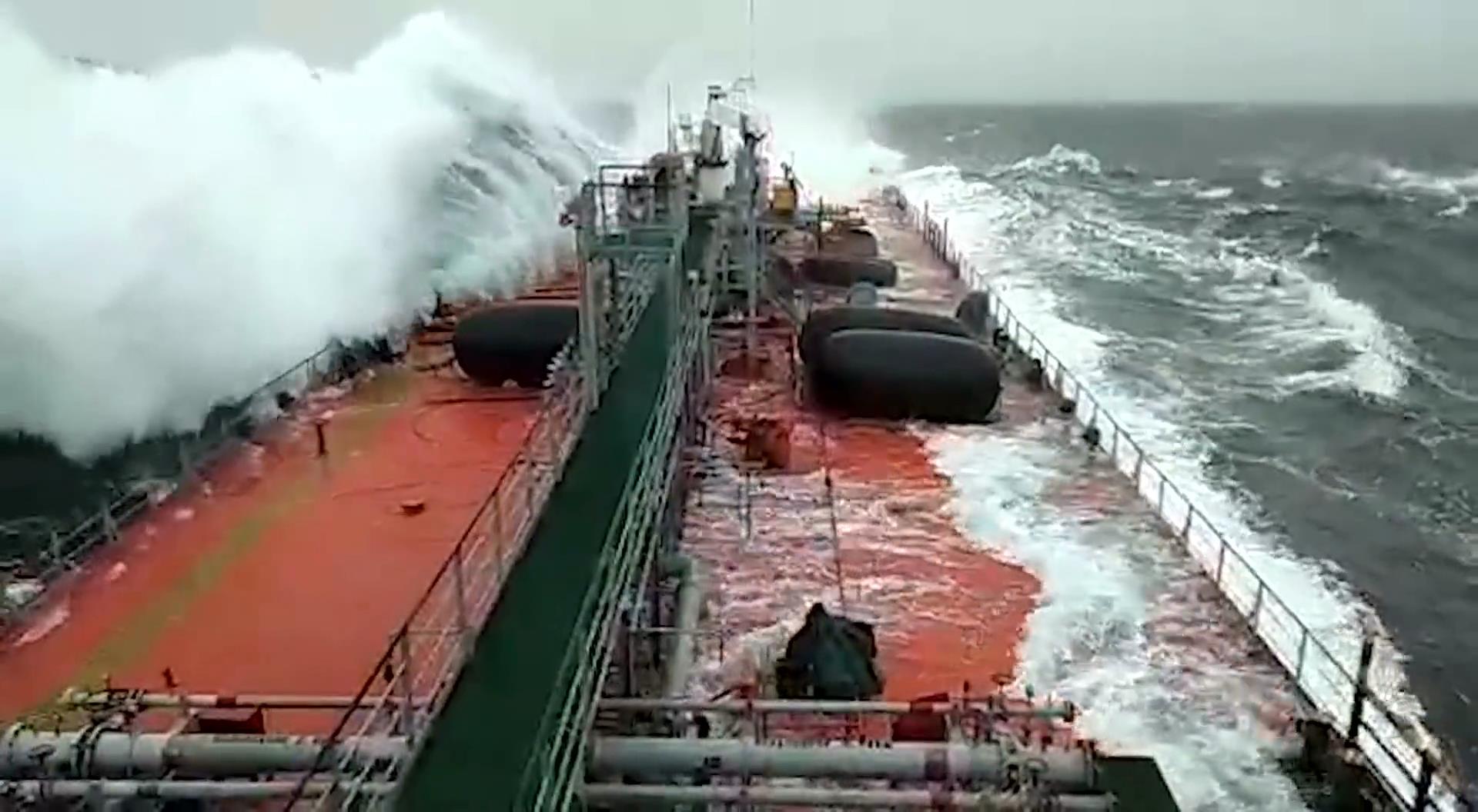 Během velké bouře v Baltském moři, Obrovská vlna zasáhla a zničila kapitánův most na ruském ropném tankeru. Naštěstí, loď mohla bezpečně pokračovat v kurzu.
