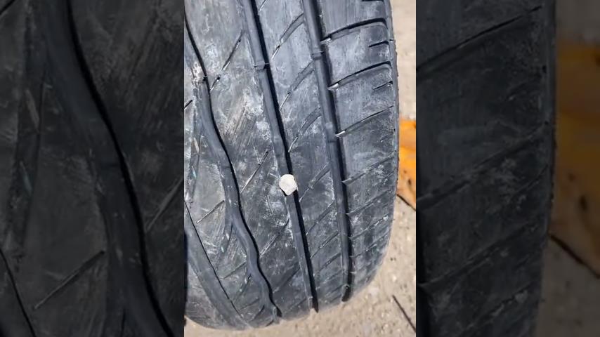 Muž nám ukazuje, jak můžeme opatrně odstranit kámen, který je zaseknutý v kole našeho auta, bez poškození pneumatiky.