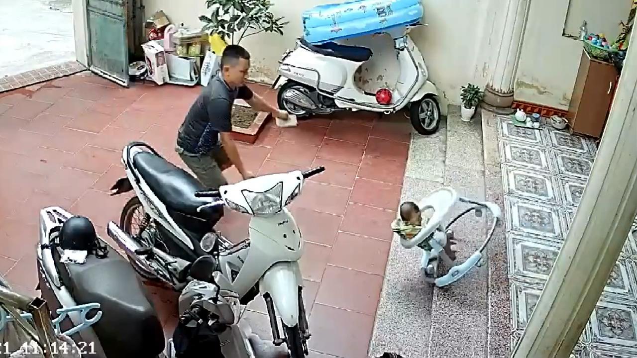 Dítě chodící v armádě, bude mít nehodu na schodech a jeho ne-armáda se převrátí. Naštěstí, jeho otec to chytil na poslední chvíli, než udeřil do hlavy.