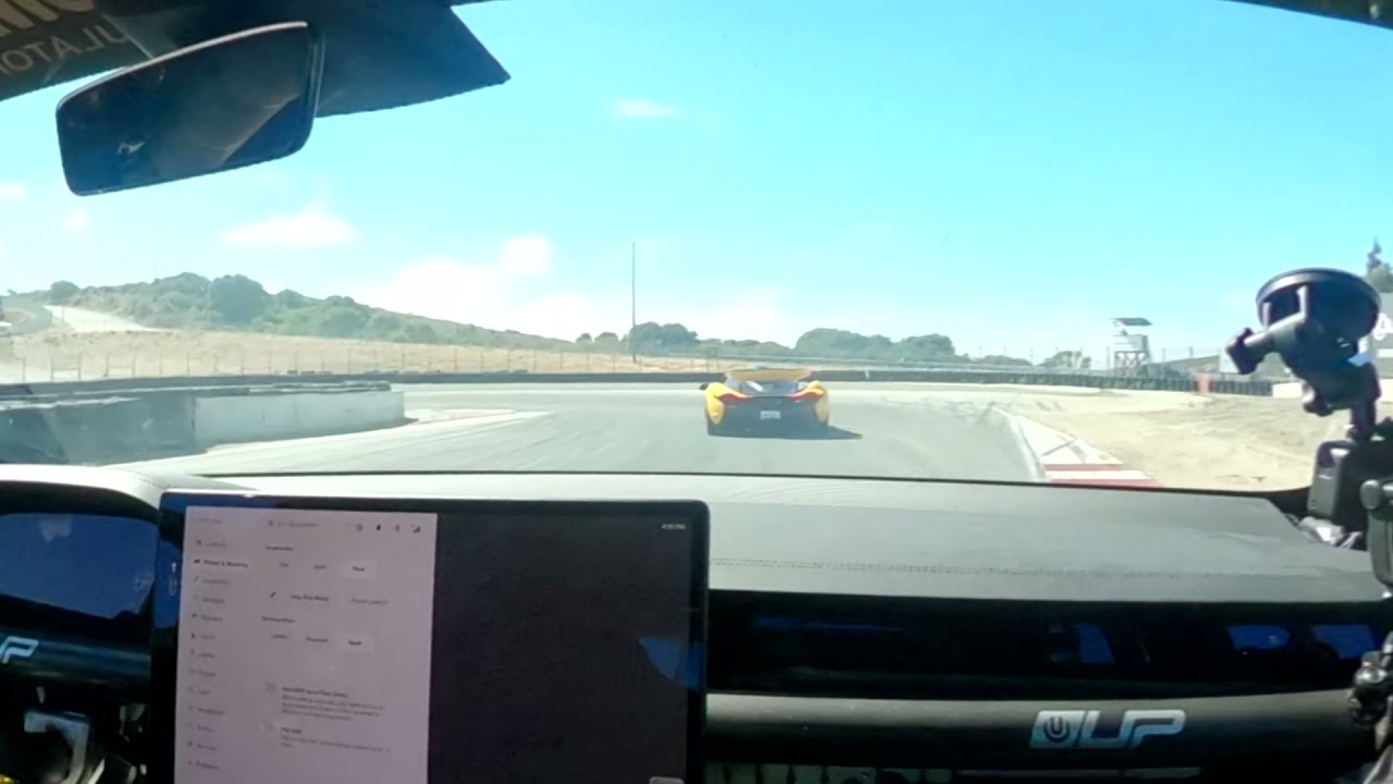 Elektrický vůz Tesla Model S Plaid předjíždí McLaren P1 a McLaren Senna na okruhu Laguna Seca v Kalifornii.