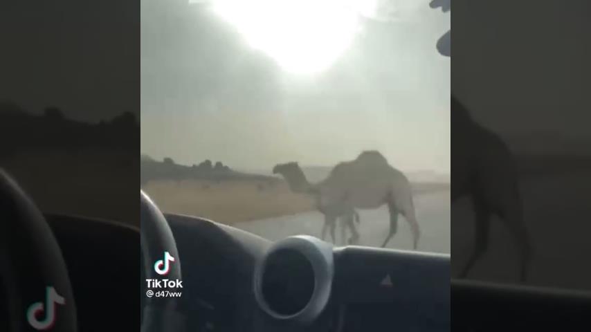 Muž v Saúdské Arábii odstraní velblouda a jeho mládě stojící uprostřed silnice.