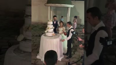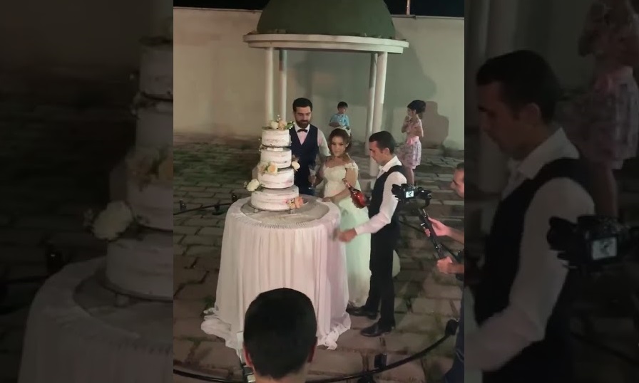 Novomanželský pár si užívá sklenku šampaňského s kaskadérskými kousky, a působivý ohňostroj.