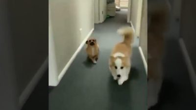 Pes se plazí, a vypadá to, že si dělá legraci ze svého přítele, který má velmi krátké nohy.