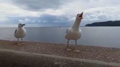 Dva racci vypadají, jako by se smáli, když třetí racek ztratí rovnováhu a spadne do vody.