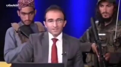 Pěší vojáci Talibanu dohlížející na moderátora afghánského televizního pořadu „Pardaz“, který vyslýchá údajného mluvčího Talibanu. Říká, že Taliban „chce, aby veřejnost spolupracovala a nebála se“